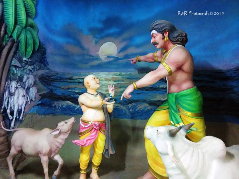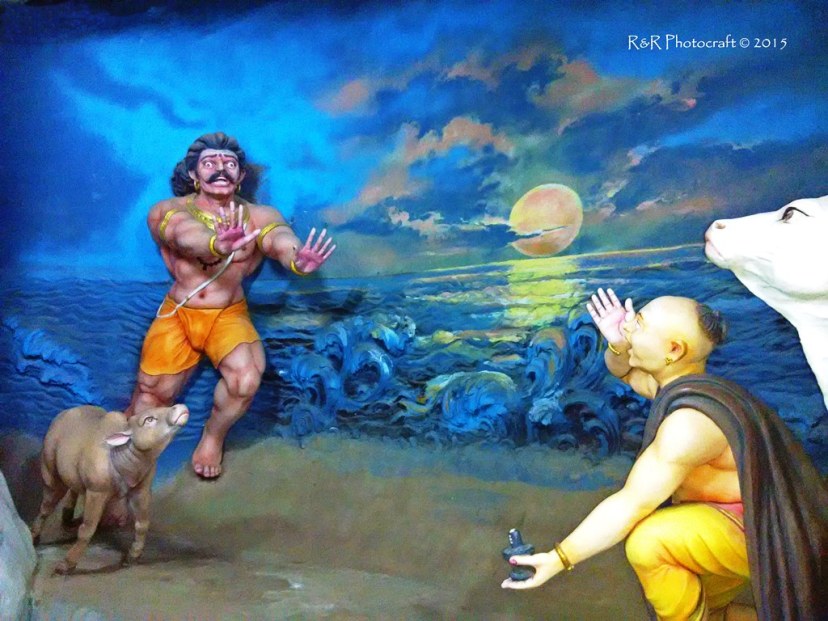 Knowing that Ravana was disciplined about his daily rituals, Lord Ganesh disguised as a brahmin boy appeared before Ravana and offered him to hold the Atma Linga while Ravana performed his daily rituals. Believing the brahmin boy, Ravana handed over the Atma Linga to Lord Ganesh and started performing his rituals. Lord Ganesh kept the Atma Linga on the ground. This infuriated Ravana and in a fit of anger, with all his might Ravana tried to uproot the Atma Linga but it didn’t budge a bit. Due to Ravana’s might, the Atma Linga got twisted and looked like a cow’s (Go) ear (Karna). The place where the Atma Linga became immobile is thus called as Gokarna and the Atma Linga itself is called as Mahabaleshwar. The furious Ravana pulled and threw the case of the linga, which fell 23 miles away at Sajjeshwar. He threw the lid to the south 27 miles away at Guneshwara which is called “Vamdev Linga”. He threw the cloth wrapped around the Atma Linga to the south, 32 miles away at Kanduka hill on the seashore which took the form of “Aghora” at Murudeshwar. The thread around the Atma Linga was flung to the south at Dhareshwara, which is called as “Tathpurusha Linga”.